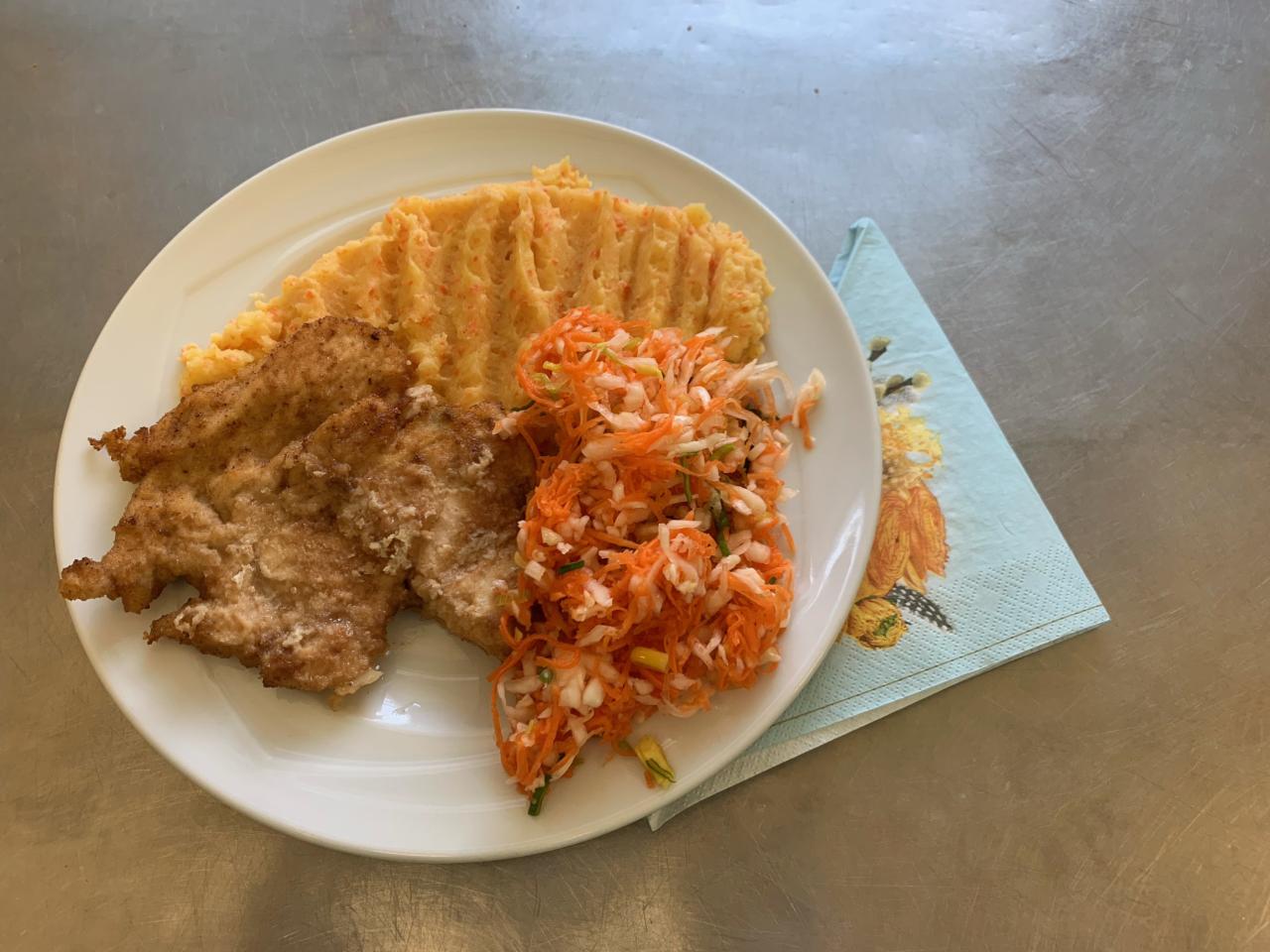 Kurací rezeň v jogurtovej marináde, zemiakovo - mrkvové pyré, šalát mix