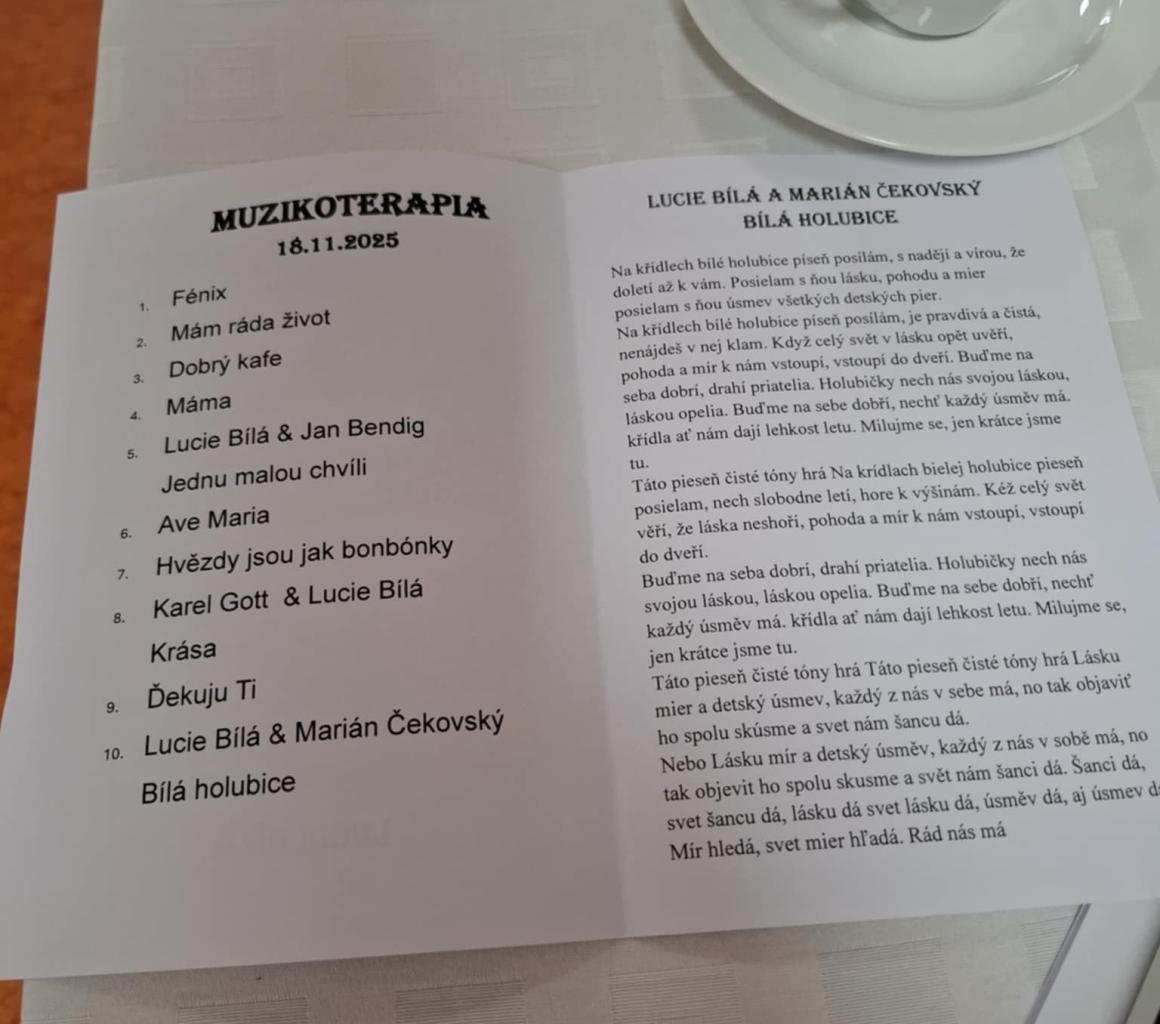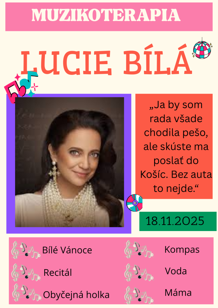 Muzikoterapia v našom zariadení bola venovaná tvorbe a piesňam Lucie Bílej. Jej silný hlas, emotívne melódie a známe skladby vytvorili príjemnú atmosféru plnú pokoja, spomienok a radosti.