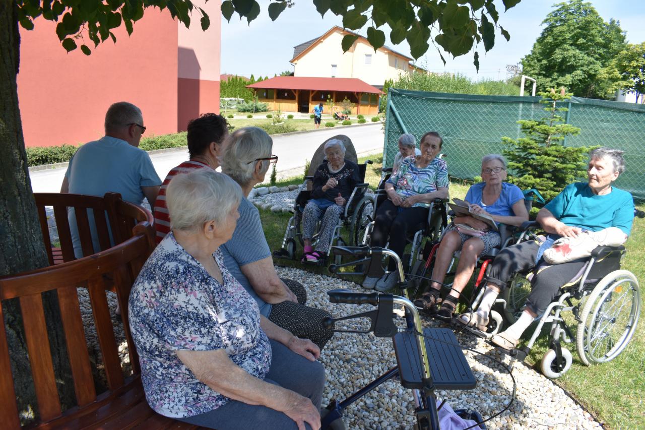 Keďže nás už slnko a teplé počasie lákajú von, snažíme sa čo najviac času tráviť v areáli. Tentokrát sme to využili na biblioterapiu - čítanie na lavičke pod lipou.